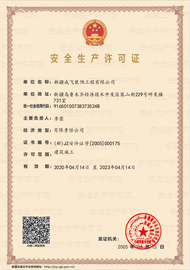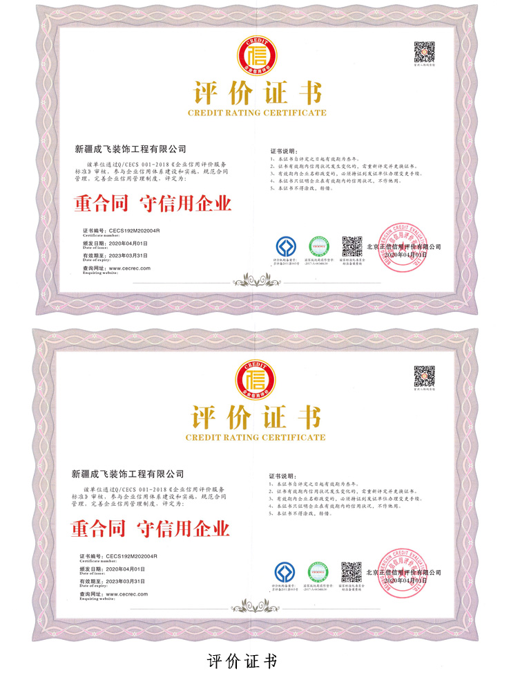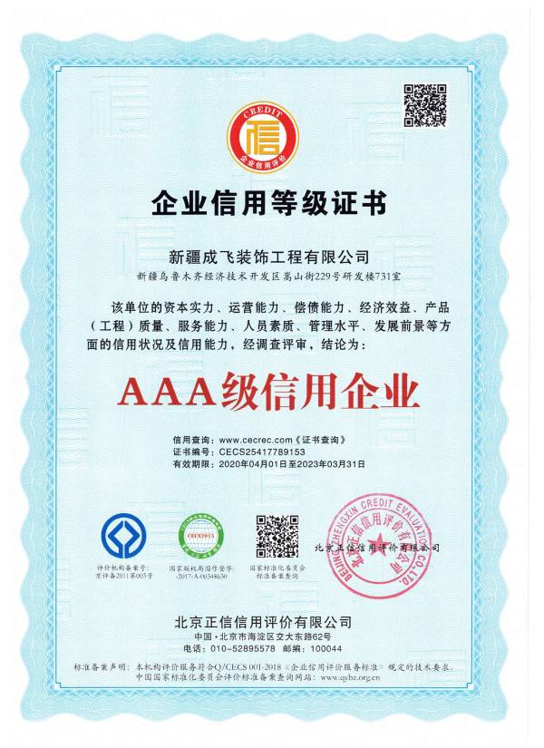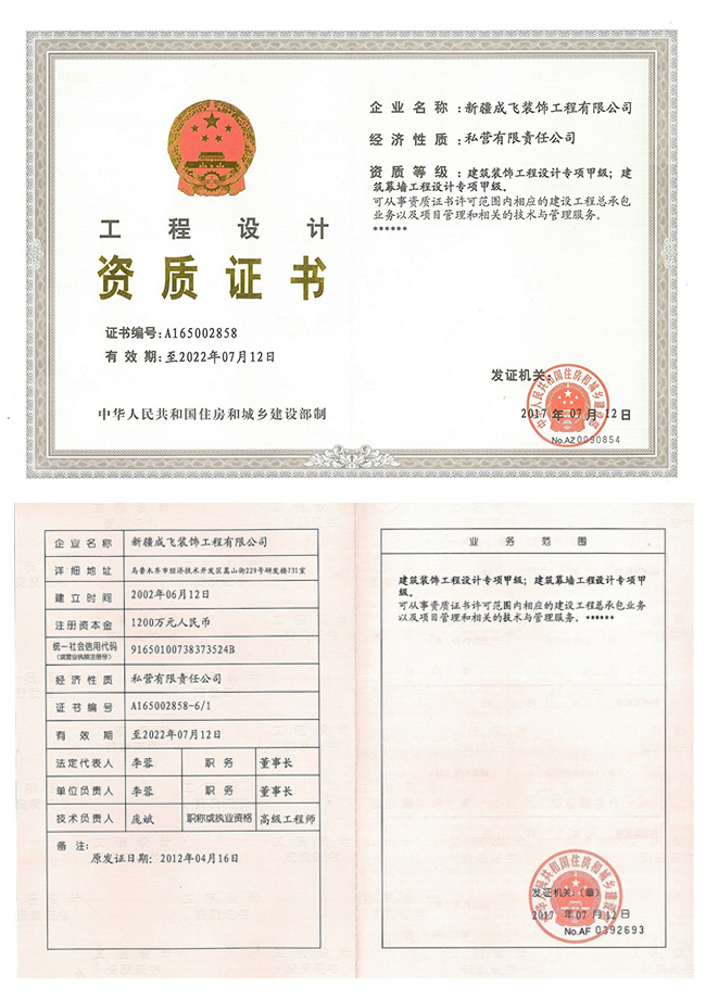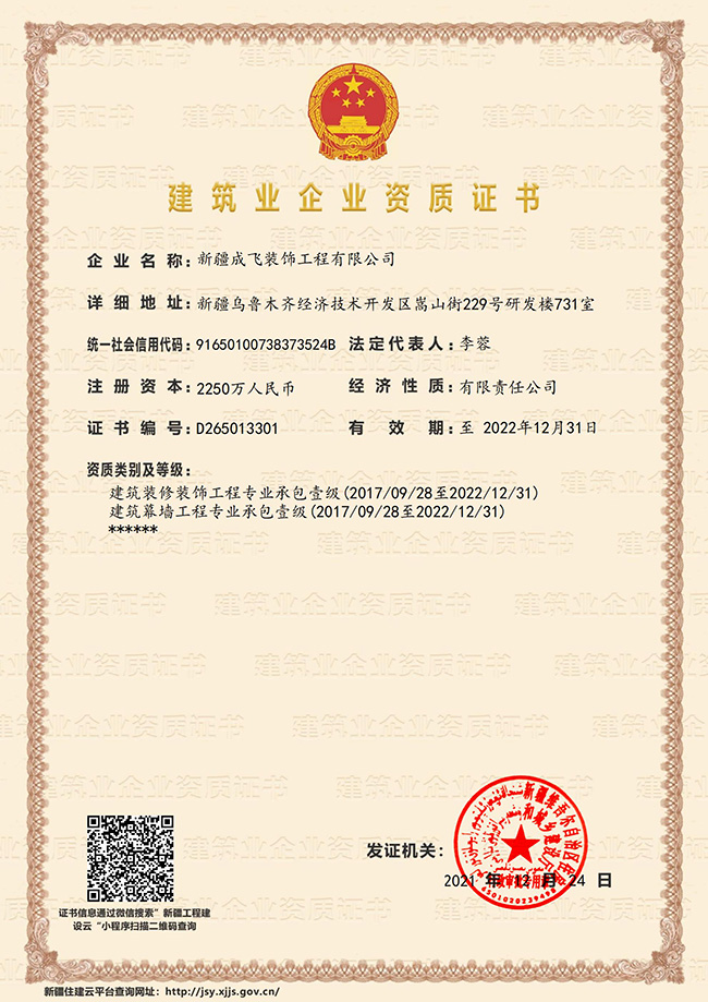 新疆成飛建設工程有限公司是一家以專注于裝飾工程領域,堅持穩(wěn)健經(jīng)營、持續(xù)創(chuàng)新、開放合作的原則,在星級賓館、高檔寫字樓、大型商場、高級餐館、娛樂設施、車站、銀行等大型室內外建筑工程(包括各類玻璃幕墻、石材幕墻、鋁板幕墻、鋼結構室內裝飾等工程)裝飾裝修...查看更多